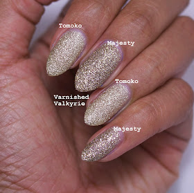 Tomoko, reminded me of Barry M Majesty. Now I knew from the get go that they weren't dupes, but I decided to compare them side by side either way. They are both champagne golds, but Majesty is slightly deeper. The formula on Majesty is a bit thicker than Tomoko, but they were both just as easy to apply. Tomoko is a bit more glitter hungry when topcoated. Finally the biggest difference is while Tomoko is just fine glitter, Majesty is both fine and larger glitter. Oh and Majesty is a bit harder to take off because of the larger pieces of glitter. One thing they did have in common was since they are both soooooooo jam packed full of glitter I find they look less textured then they actually are.